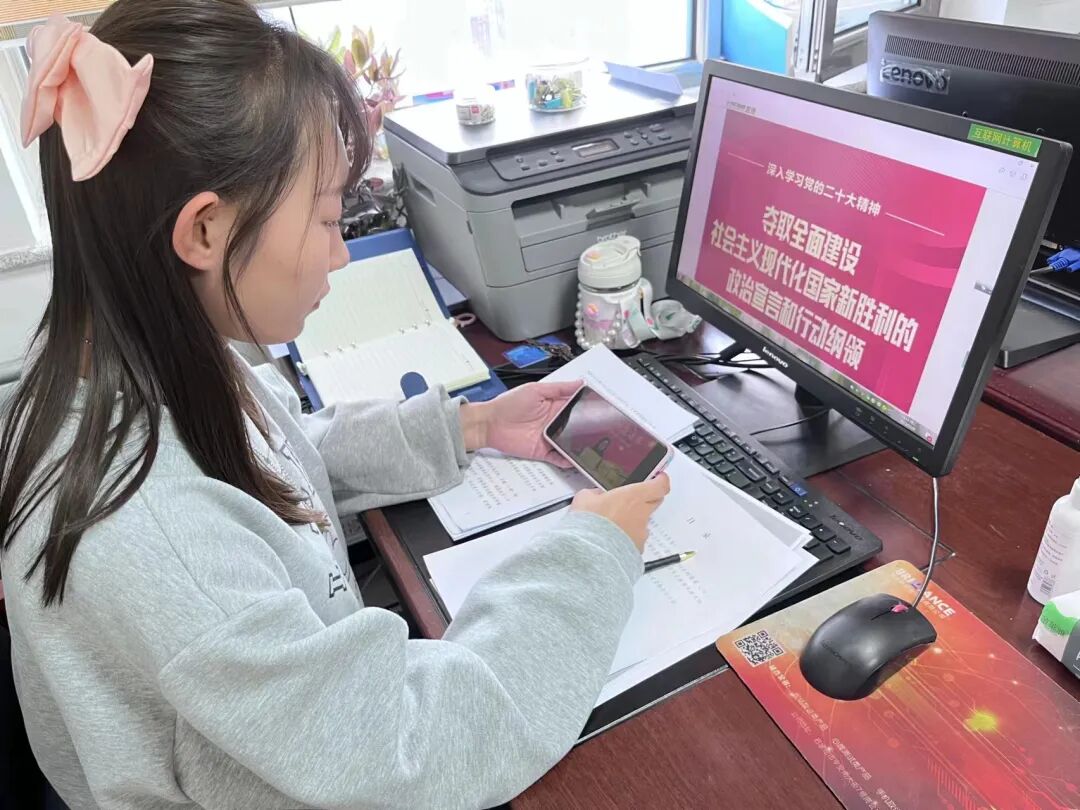 组建党的二十大精神学习宣传微信工作群,及时在群内推送二十大报告全文、新华社权威发布的“一图速览二十大报告”“党的二十大报告学习手账”“二十大报告金句”等学习资料,确保把党的二十大精神传达到每一名党员干警。通过“学习强国”学习平台“学习宣传贯彻党的二十大精神”“党的二十大精神答题活动”栏目,以及张家口市委讲师团线上宣讲,组织全体党员干警认真开展自学,踊跃参与答题,晾晒答题成绩,全体党员干警学习热情高涨,不仅在微信群积极点赞,还纷纷撰写心得体会,分享学习收获。各党小组在繁忙的工作之余,积极组织小组内党员开展热烈讨论,交流收听收看感想。