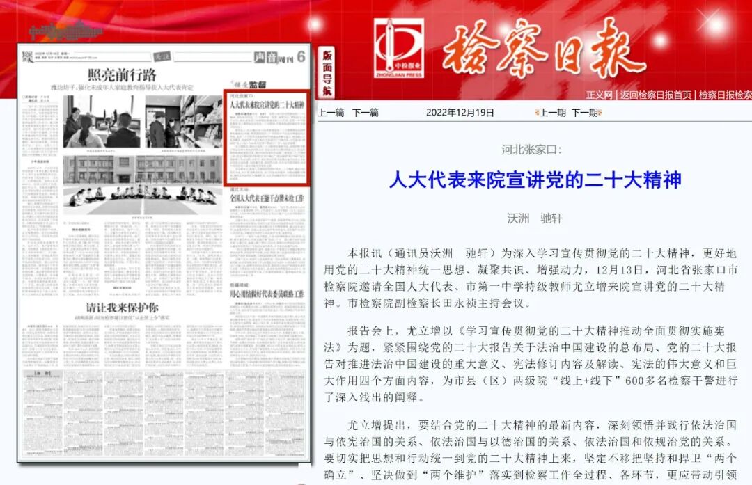 为深入学习宣传贯彻党的二十大精神,更好地用党的二十大精神统一思想、凝聚共识、增强动力,12月13日,河北省张家口市检察院邀请全国人大代表、市第一中学特级教师尤立增来院宣讲党的二十大精神。市检察院副检察长田永祯主持会议。