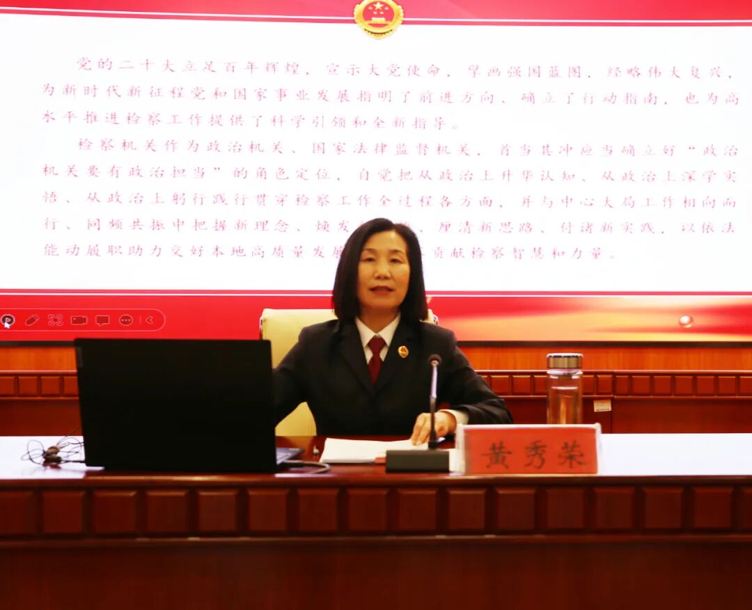 讲课中,黄秀荣分享了自己学习宣传贯彻党的二十大精神的所思所悟所感,勉励全体干警要承担起更重的使命职责,忠诚捍卫“两个确立”、坚决做到“两个维护”,切实把思想统一到党的二十大精神上来,把力量凝聚到党的二十大确定的各项任务上来,持续改进和加强检察机关法律监督工作,找准为大局服务、为人民司法的切入点和着力点,推动各项检察工作全面创优、提质提效,为在中国式现代化新征程上交出高质量发展优异答卷贡献检察力量。