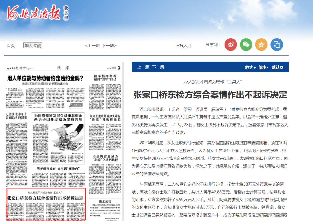 “谢谢检察官能充分为我考虑,我真没想到,一时图方便找私人兑换外币竟带来这么严重的后果。以后我一定格外注意,避免此类情况再次发生……”5月28日,柳女士收到不起诉决定书后,握着张家口市桥东区人民检察院检察官的手连连致谢。